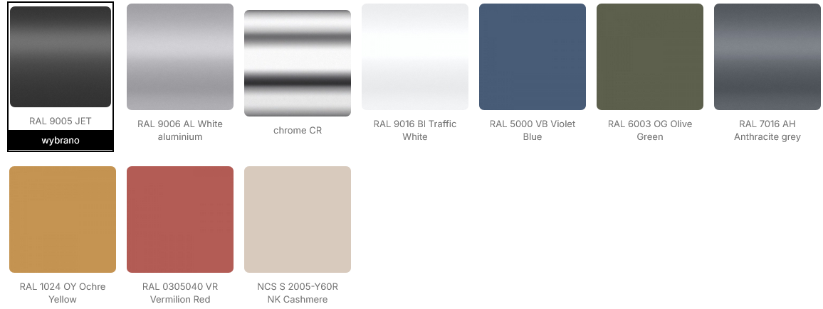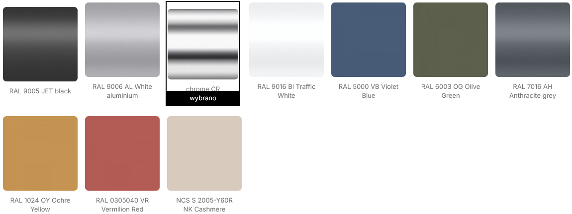 Cztery metalowe nogi zapewniają solidność i trwałość konstrukcji, malowane proszkowo - 9 kolorów do wyboru lub w eleganckim wykończeniu