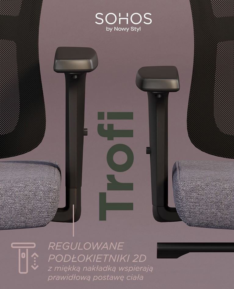nakładkami poliuretanowymi (PU). Zakres regulacji góra - dół 95 mm, ruch nakładki przód-tył 50 mm. Regulowane podłokietniki umożliwiają